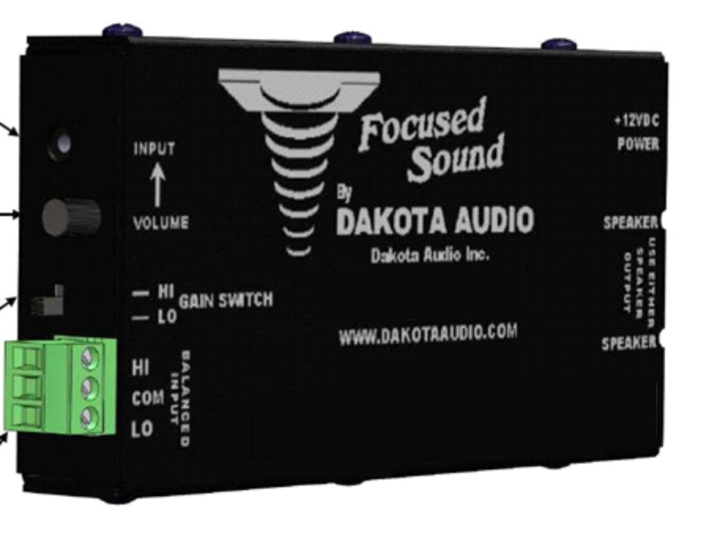 The Dakota Audio MA-5 arrays provide a broader sound range compared to the popular MA-4 Mini Array, with a frequency response optimized for voice. The MA Series delivers a highly directional side-to-side sound with a wide vertical pattern. This design ensures effective sonic isolation between displays while offering consistent coverage for listeners, regardless of their height. To accommodate size constraints, the amplifier is positioned remotely from the speaker array and connected by a 6′ multi-conductor cable. (included). (For maximum intelligibility or smaller size, please check out our MA-4 Series). The MA-5 units are usually mounted horizontally above or below a display or screen, but have other applications such being suspended overhead to provide a “path” of sound.